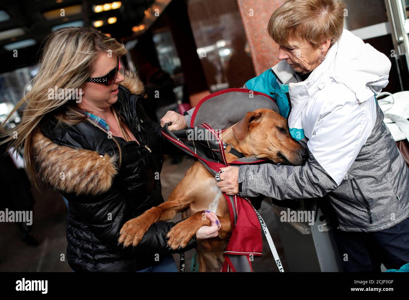 Player A Rhodesian Ridgeback From Denver Colorado Has A Coat Put On Him By Owner Emma Marshall L And Rosemary Green Outside The Hotel Pennsylvania In Midtown Manhattan In New York City